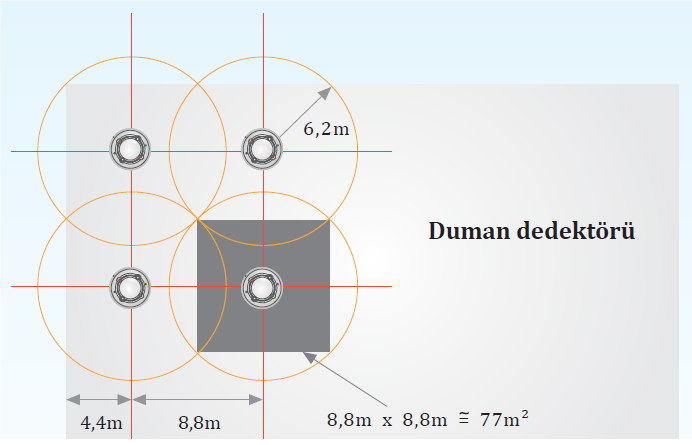 2018 yılında yayınlanarak, yürürlüğe giren standartta ilk dikkat çeken konulardan biri dedektörlerin yerleşim aralıklarıdır. Proje ve uygulamalarda en sık kullandığımız optik duman dedektörlerinin etkin koruma alanı yeni düzenleme ile azaltılmıştır. Önceki versiyonlarda 7,5m olarak belirtilen etkin koruma yarıçapı, 2018 yılından itibaren 6,2m olarak düzenlenmiştir. Yapılan bu düzenleme ile Açık alanda bir kare dizisi için optik duman dedektörlerinin duvar ile olan mesafesi 4,4m olmuş, iki dedektör arası mesafe 8,8m olarak belirlenmiş ve sonuç olarak bir optik duman dedektörünün etkin olarak koruduğu alanın yaklaşık 77m2 olacak şekilde projelendirilmesi istenmiştir. 2m’den dar koridorlar için ise iki duman dedektörü arasının 12,4m ve dolayısıyla duvar ile dedektör arası mesafenin de 6,2m olarak projelendirmesine standart olanak tanımıştır.
