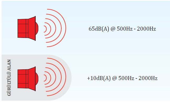 Sesli uyarıcı yerleşimi yapılırken, asgari ses seviyesi 65dB(A) olması veya 30sn’den uzun süreli oluşabilecek diğer gürültülerden 5dB(A) fazla olması isteniyordu. Yeni güncelleme ile 65dB(A) sabit kalırken, gürültülü alanlar için +10dB(A)’lık bir tasarım kriteri gelmiştir.