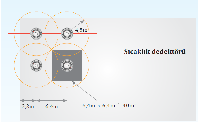 Yapılan bir diğer önemli değişiklik ise sıcaklık dedektörlerinin etkin koruma alanı ile ilgili. Sıcaklık dedektörlerinin de etkin koruma alanı yeni düzenleme ile azaltılmıştır. Önceki versiyonlarda 5 m olarak belirtilen etkin koruma yarıçapı, 2018 yılından itibaren 4,5 m olarak düzenlenmiştir. Yapılan bu düzenleme ile Açık alanda bir kare dizisi için sıcaklık dedektörlerinin duvar ile olan mesafesi 3,5m olmuş, iki dedektör arası mesafe 6,4m olarak belirlenmiş ve sonuç olarak bir sıcaklık dedektörünün etkin olarak koruduğu alan yaklaşık 40m2 olacak şekilde projelendirilmesi istenmiştir. 2m’den dar koridorlar için ise iki duman dedektörü arasının 9m ve dolayısıyla duvar ile dedektör arası mesafenin de 4,5m olarak projelendirmesine standart olanak tanımıştır.