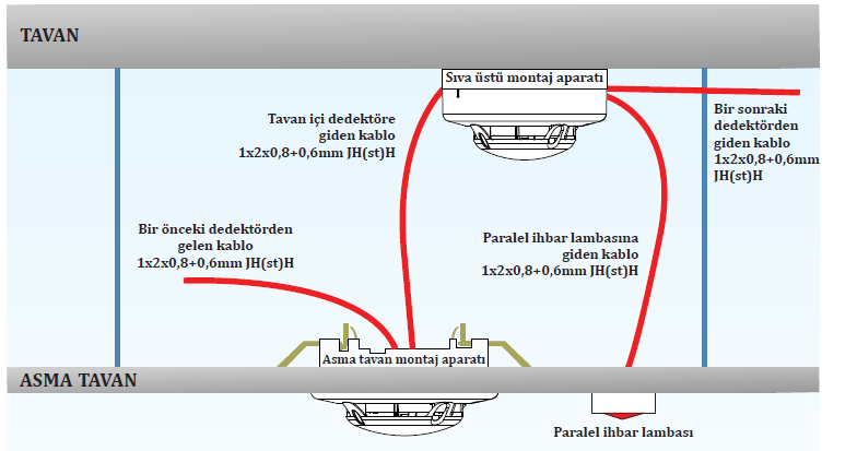 Yapılan bir diğer önemli değişiklik asma tavan arasında kullanılması gereken dedektörler ile ilgili. Önceki standartta, herhangi bir noktadaki kabloların yanıcılık katsayısı olarak 25MJ değerini geçmesi durumunda asma tavan arası dedektör kullanımı zorunlu idi. Yeni yapılan düzenlemede ise Kabloların yangına dayanıklı olup olmaması da irdelenemeye başladı. Eğer kablolar yangına dayanıklı ise yine 25MJ değerine göre hesaplama yapılmakta. Ancak kablo grubu arasında tek bir yangına dayanıklı kablo bile olmaması durumunda bu değer 15MJ olarak değerlendirilmekte.